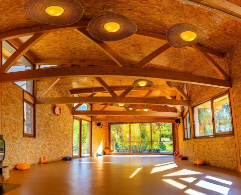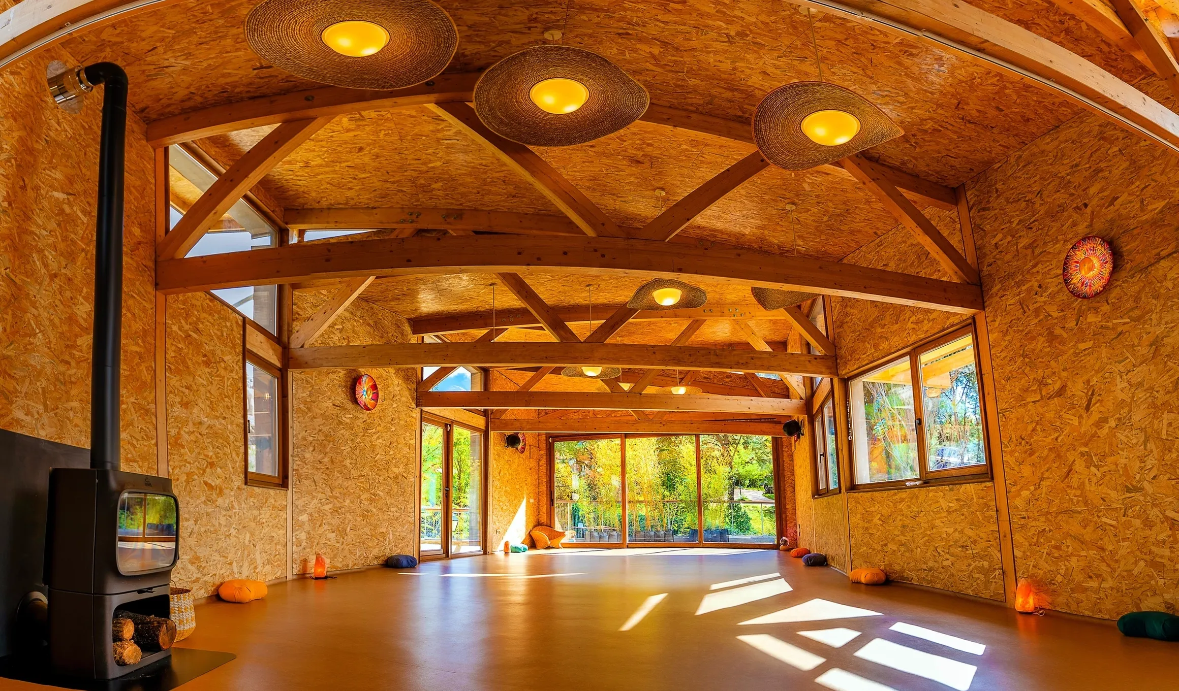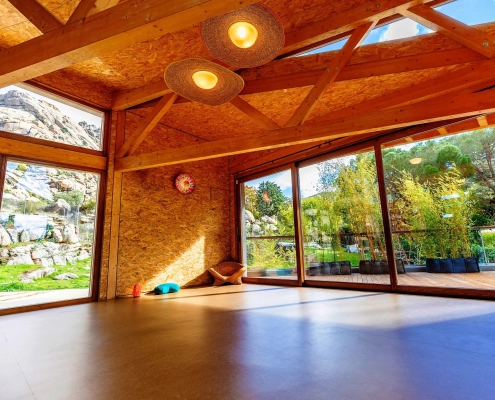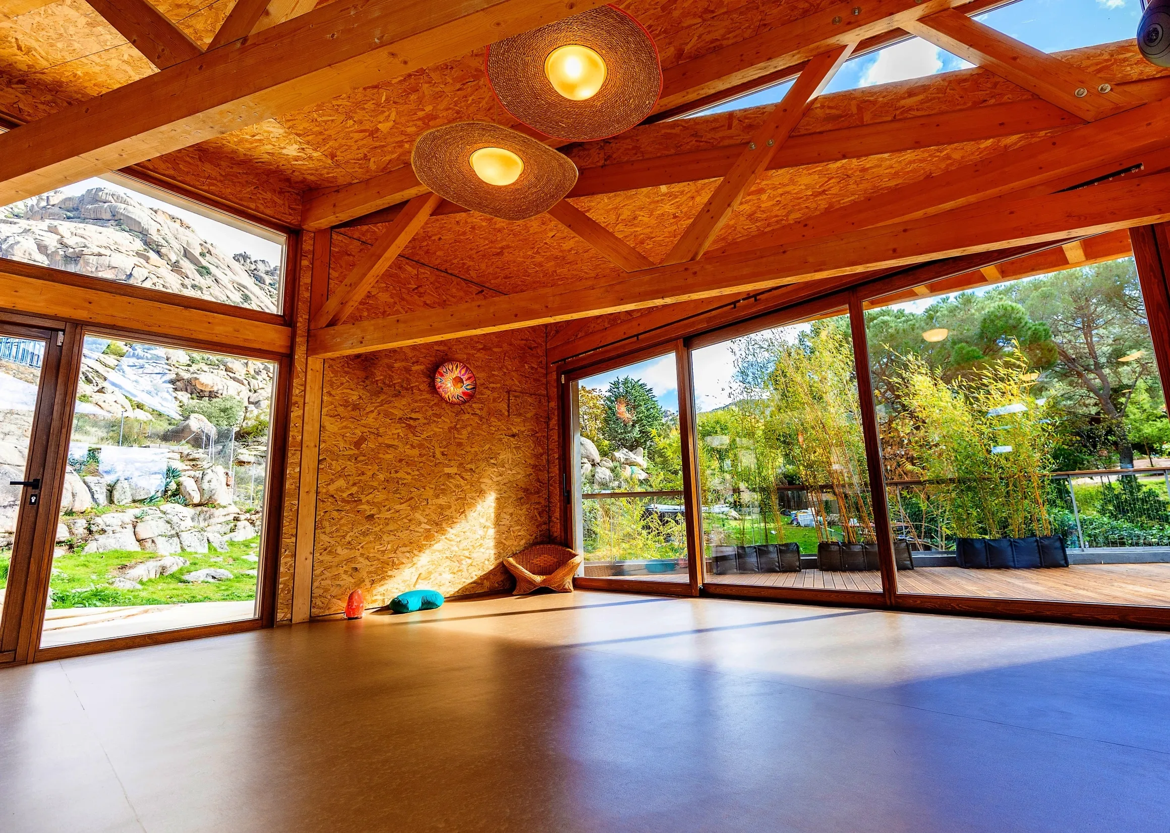 La práctica de yoga se realiza en una sala con amplios ventanales y terraza y vistas directas a la montaña, un espacio que sostiene y acompaña, facilitando que la mente se calme y el cuerpo se abra a la experiencia.
